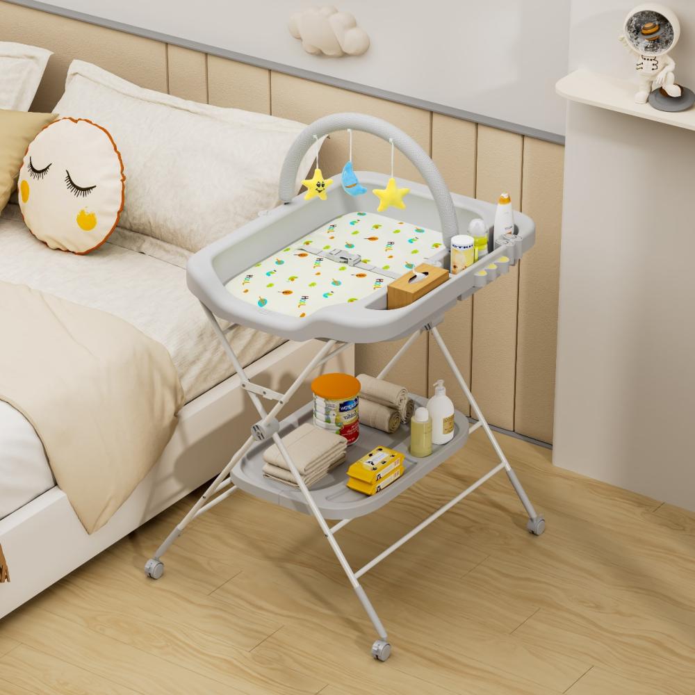 طاولة تغيير الحفاضات القابلة للطي مع حوض استحمام وألعاب.